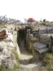 En montant quelques marches on accède au pied du socle d'où l'on découvre un vaste panorama sur l'ancien front de Champagne. Le terrain resté en l'état porte encore les marques des combats : tranchées, boyaux, cratères...
