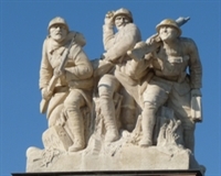 Le Monument est surmonté d'un groupe sculpté représentant trois patrouilleurs pour lesquels le sculpteur Real Del Sarte a emprunté le traits du Général Gouraud, De Quentin Roosevelt, fils du Président des Etats-Unis, et de son propre frère tombé au Chemin des Dames.