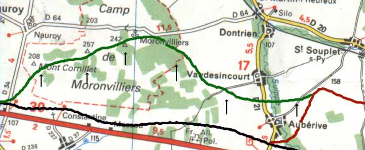 Les monts de Moronvilliers ont constitué un point d'observation stratégique pour l'armée allemande durant toute la guerre. Leur prise aurait inversé la situation et permis aux Français une vue sur les arrières ennemies. Cette bataille des monts se rattachera à l'offensive franco-britannique sur la Scarpe et sur l'Aisne, elle se déroulera du 17 avril au 20 mai 1917. La préparation d'artillerie va durer sept jours, le 20 avril les français sont au sommet du Cornillet du Mont Blond, du Mont Haut du Téton et du Mont Sans Nom. Les Allemands vont contre-attaquer violemment depuis le tunnel du Cornillet qui constitue un refuge pour toutes les troupes ennemies, rendant longtemps la victoire indécise. Il faudra attendre le 20 mai pour qu'un obus de 400mm tiré depuis le camp de Mourmelon atteigne une cheminée d'aération et asphyxie 600 jeunes soldats venus en réserve, le tunnel est évacué et la victoire est française. 6000 Allemands seront faits prisonniers durant cette bataille qu'ils nommeront " la bataille des géants ".Pour le plan de bataille Cliquez: Ici